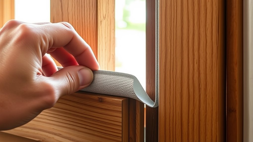 To choose the right weather stripping, I first consider my door’s gap size and material. For small gaps, I use foam tape, while for larger gaps, I prefer vinyl or rubber weatherstripping. I also check if my door swings inward or outward, which affects the type I select. Testing for drafts helps me decide, ensuring I pick a sealing method that fits snugly and lasts long.