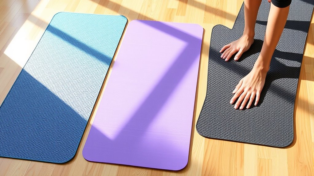 A non-slip surface texture is essential for ensuring safety and stability during yoga practice, especially for beginners. It provides the grip needed to prevent slipping during various poses, even when you start to sweat. Textured patterns like diamond, waffle, or wavy surfaces improve traction and help you stay grounded. Some mats feature double-sided textures, offering reliable grip regardless of moisture levels. The material also plays a critical role; natural rubber and TPE are popular choices because they enhance grip and feel comfortable under your hands and feet. Proper surface design helps maintain correct alignment and reduces injury risk. When selecting a mat, consider how the texture supports your practice, ensuring you feel secure and confident in every pose.