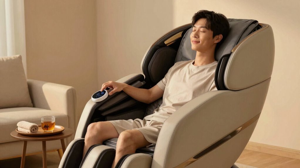 When life gets hectic, taking just 12 minutes to reset can make a world of difference. You might think that a massage chair alone can handle your stress, but pairing it with a focused routine enhances its effectiveness. Incorporating simple stress reduction techniques during these moments can deepen the relaxation, making the massage feel more restorative. One way to maximize this short break is to use aromatherapy benefits to your advantage. A few drops of calming essential oils like lavender or chamomile can create an environment that soothes your mind and body. As you settle into the chair, take a moment to breathe deeply, inhaling the fragrant air slowly. This practice not only enhances your mood but also helps lower cortisol levels, amplifying the stress reduction benefits of your massage.
