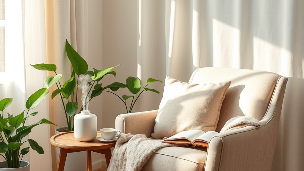Creating a calm environment in your space starts with choosing soothing colors and decluttering your area. A tidy, relaxing space helps clear your mind and reduces stress. Incorporate aromatherapy scents like lavender or chamomile to promote tranquility. Use cozy lighting, such as soft lamps or string lights, to create a warm, inviting atmosphere. To deepen your relaxation setup, consider: