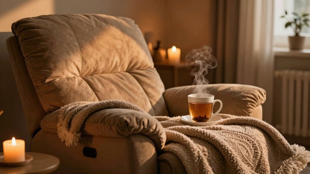 To enhance your recovery routine, incorporate mindful stretching to improve flexibility and release tension. Add calming scents like lavender or chamomile to create a soothing atmosphere that promotes relaxation. You can also include gentle breathing exercises to calm your mind. These elements work together with heat, recline, and quiet to deepen your sense of rest and recovery, making your Sunday night routine even more effective and restorative.