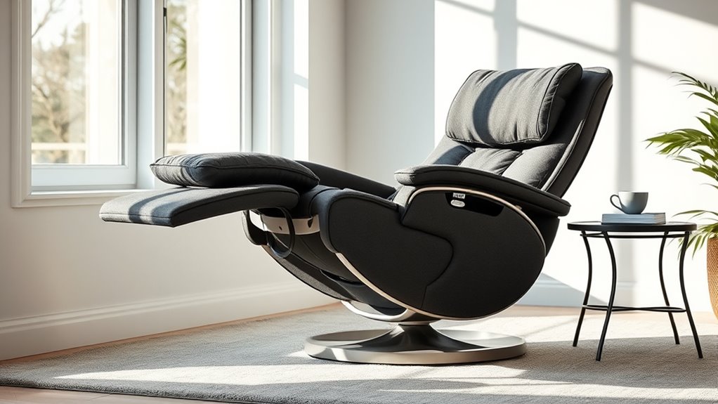 Zero gravity recliners offer several key advantages that can substantially enhance your relaxation experience. One major benefit is their ergonomic design, which promotes better spinal alignment and reduces pressure on your joints. This support helps prevent discomfort after long periods of sitting, making it ideal for relaxation or recovery. Additionally, these recliners boast a sleek, modern aesthetic appeal that complements various interior styles. The clean lines and stylish finishes can elevate your space’s look while providing functional comfort. The combination of ergonomic benefits and aesthetic appeal means you get both health-supportive features and a stylish piece of furniture. Investing in a zero gravity recliner ensures you enjoy improved comfort and a visually appealing addition to your home. Moreover, their inspirational design principles reflect a focus on enhancing well-being and emotional comfort, making them a thoughtful choice for your living space.