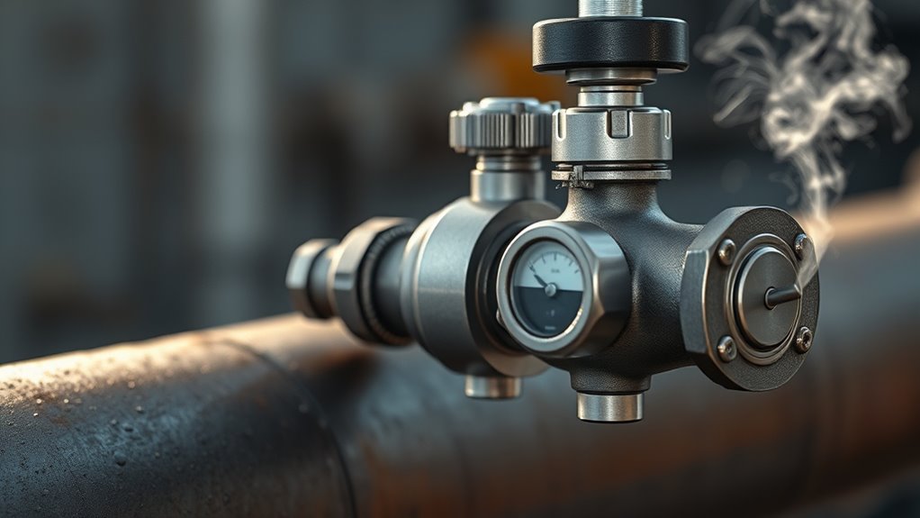 Environmental conditions, such as temperature fluctuations, humidity, and exposure to corrosive elements, can profoundly impact the performance of relief valves. These environmental factors influence how relief devices operate over time, potentially causing corrosion, material degradation, or incorrect opening pressures. When selecting a relief device, it’s vital to consider the specific environmental conditions it will face to guarantee reliable performance and safety. Proper relief device selection involves choosing materials resistant to corrosion and designing for temperature extremes. Ignoring environmental factors can lead to valve failure, leaks, or inaccurate pressure relief, risking equipment damage or safety hazards. Always evaluate your system’s environment thoroughly to select the right relief valve, guaranteeing it maintains ideal performance under all conditions.