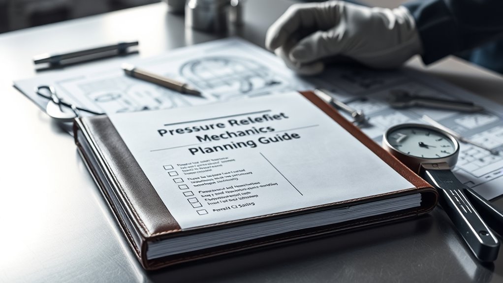 Understanding pressure relief mechanics is fundamental for designing safe and efficient systems. Before diving into the specifics, it’s important to have a clear checklist that guides your planning process. This helps guarantee you don’t overlook critical components like safety protocols and maintenance schedules, which are essential for reliable operation. Your first step should be to assess the system’s operational parameters thoroughly. Identify the maximum pressure levels the system will encounter and confirm that your relief devices are rated accordingly. This step helps prevent over-pressurization, which can lead to system failure or safety hazards. Incorporate safety protocols into your planning by establishing clear procedures for installing, testing, and operating pressure relief devices. These protocols should align with industry standards and local regulations to guarantee compliance and safety. You also need to review existing maintenance schedules to guarantee ongoing system reliability. Regular maintenance is key to identifying wear and tear early, preventing unexpected failures, and maintaining ideal performance. Include inspections of relief devices, pressure gauges, and associated piping in your checklist. Establish a routine for testing relief valves periodically to verify they open at the designated pressure. This guarantees that your safety mechanisms function correctly when needed. When considering device selection, evaluate different types of relief mechanisms—such as spring-loaded relief valves or rupture discs—based on your system’s specific requirements. Make sure the chosen devices are compatible with your operational environment, and verify their certifications and standards compliance. Next, you should map out the installation process, paying close attention to the placement of relief devices within the system. Proper positioning is essential for rapid pressure relief and to avoid interference with other components. Document all installation procedures carefully, emphasizing safety protocols to protect personnel during setup. It’s also wise to plan for training your team on the importance of safety protocols related to pressure relief systems. Educate staff on how to perform inspections, recognize signs of device malfunction, and respond effectively to pressure excursions. Additionally, understanding essential oils for safety and health can support your overall system safety environment by promoting well-being and reducing stress among personnel. Finally, incorporate a review process into your planning checklist. Regularly revisiting safety protocols, maintenance schedules, and system performance data helps identify opportunities for improvement. This proactive approach minimizes risks, enhances safety, and guarantees that your pressure relief mechanics perform reliably over time. By addressing these core elements upfront, you set a solid foundation for a safe and efficient pressure relief system that can handle operational demands while safeguarding personnel and equipment alike.