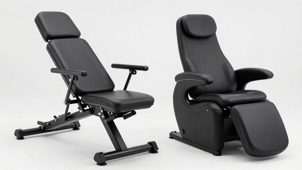 When considering Zero-G chairs and inversion tables for beginners or those with sensitive conditions, safety becomes a key concern. Zero-G chairs often feature ergonomic design that distributes weight evenly, reducing strain on your joints and spine. Their sleek, aesthetic appeal makes them inviting without intimidating users. In contrast, inversion tables can feel more formidable, especially for sensitive bodies, due to their full inversion capability. Here’s a quick comparison: | Feature | Zero-G Chairs | Inversion Tables | |———————–|———————————-|——————————-| | Safety for beginners | High, thanks to ergonomic design| Moderate, inversion may cause discomfort | | Ease of use | Simple, stable, and comfortable | More complex, requires caution | | Aesthetic appeal | Modern, inviting | Functional, utilitarian | | Suitable for sensitive bodies | Yes, gentle positioning | Less so, due to full inversion | Additionally, the body mechanics involved in inversion can be challenging for some users. Proper maintenance and understanding of the equipment can significantly impact safety and comfort during use. Consistently practicing proper technique can help minimize risks and enhance benefits. Regularly consulting professional guidance can also help ensure safe practice.